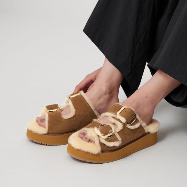 ムートンを使用したふわふわの履き心地が魅力の、ビックバックルサンダル。