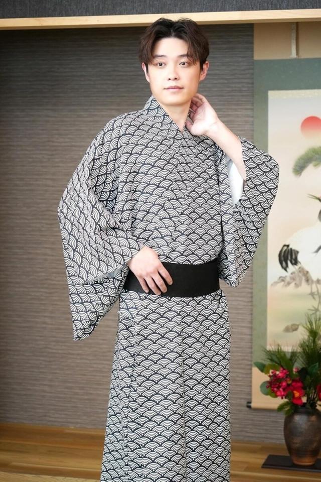 青海波模様が豪華な着物です。柔らかな生地で着心地も抜群。帯は作り帯となっていて、腰に巻いた後に面ファスナーで留めるだけで簡単に着用することが出来ます。
