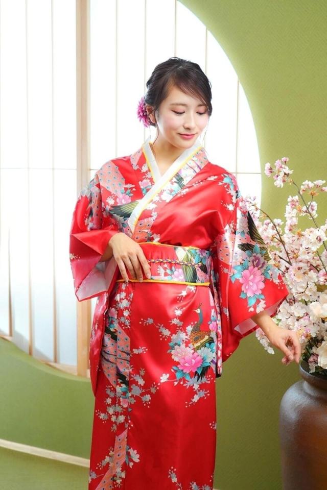 孔雀の柄が大きく入った赤色の着物です。華やかな柄とサテンの艶やかな生地が豪華絢爛な見た目となっています。帯飾りは成形済みなので、帯に通すだけ、帯は紐を結ぶだけの簡易的な仕様です。