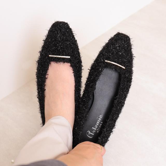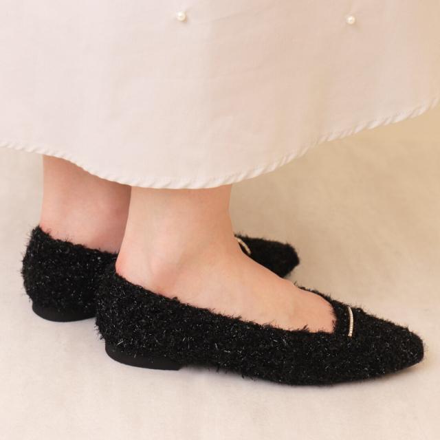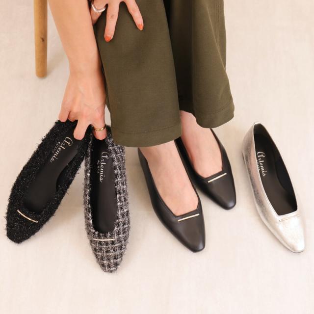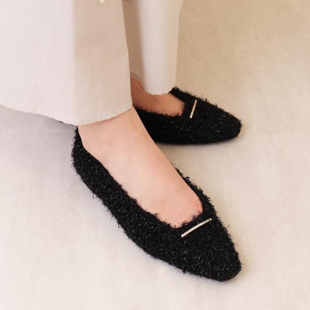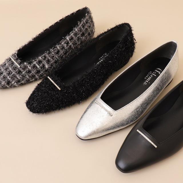 ・シンプルなデザインにラインストーンバーが映える、片足130gの軽量フラットシューズ。