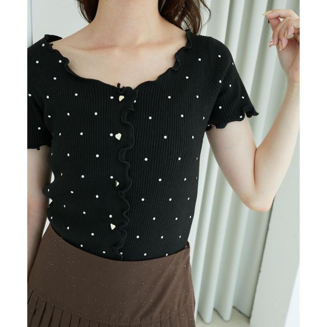 端に施したメロウフリルとフロントのハートボタンがガーリーなムードをプラス。