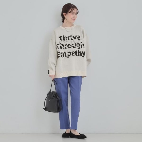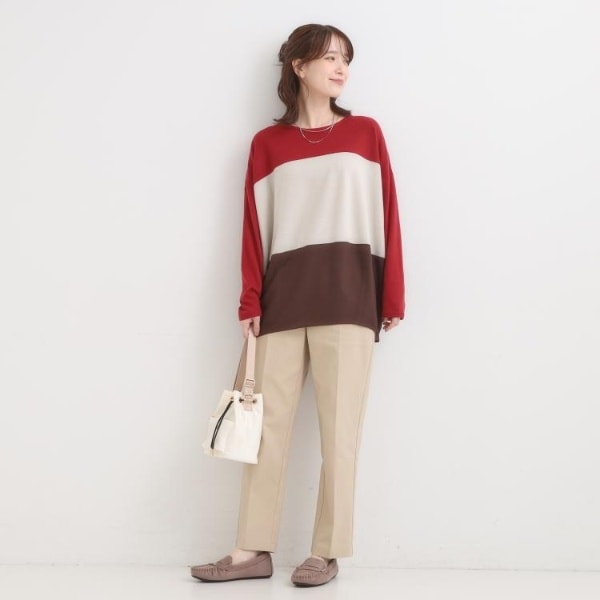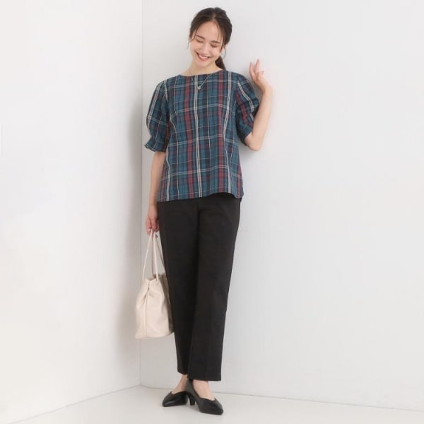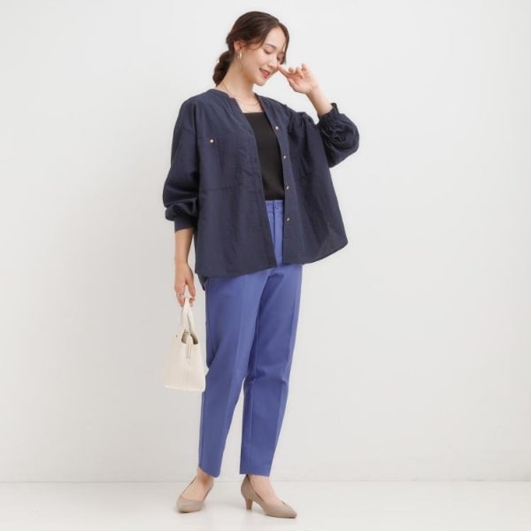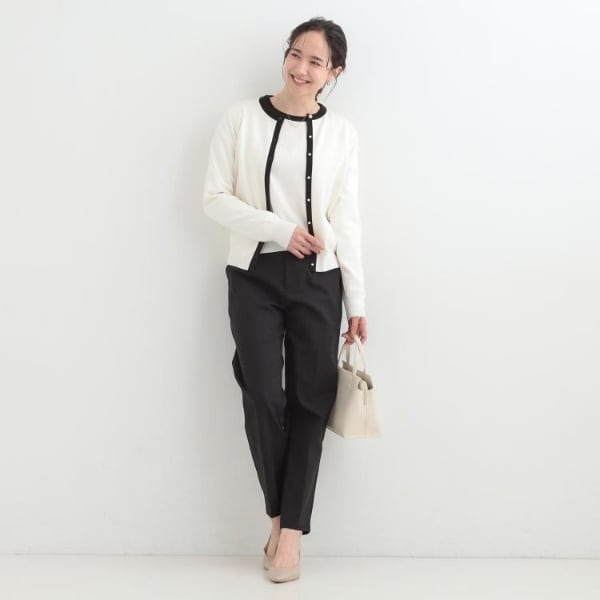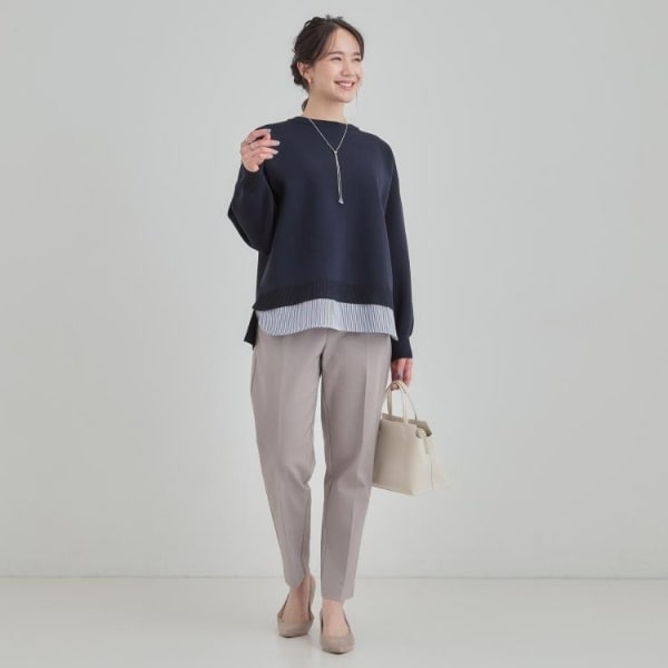 すっきりと見えるシルエットなので、きれいめなブラウスやカットソーを合わせてきちんと感あるオフィススタイルに。