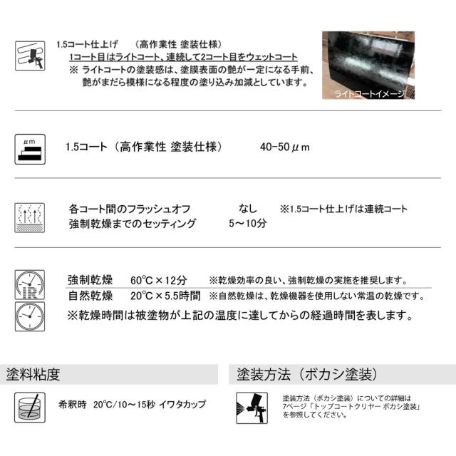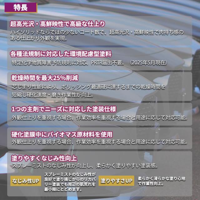 ★超高光沢・高鮮映性で肉持ち感のある高外観仕上りを実現可能にする環境配慮型 2:1 アクリルウレタンハイソリッド トップコートクリヤーです。