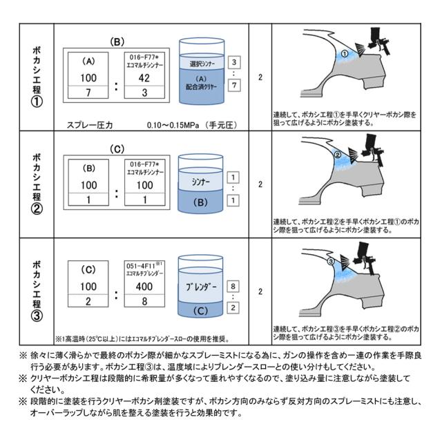 ・シンナー希釈率の下限値20%を選択し塗装される場合には、ハイソリッドクリヤー性能が顕著に現れます。過剰な膜厚にならないように注意を払ってください。