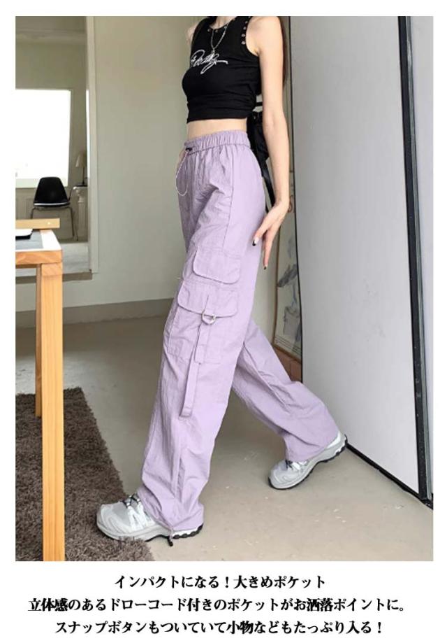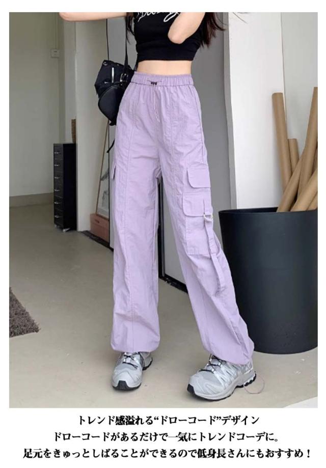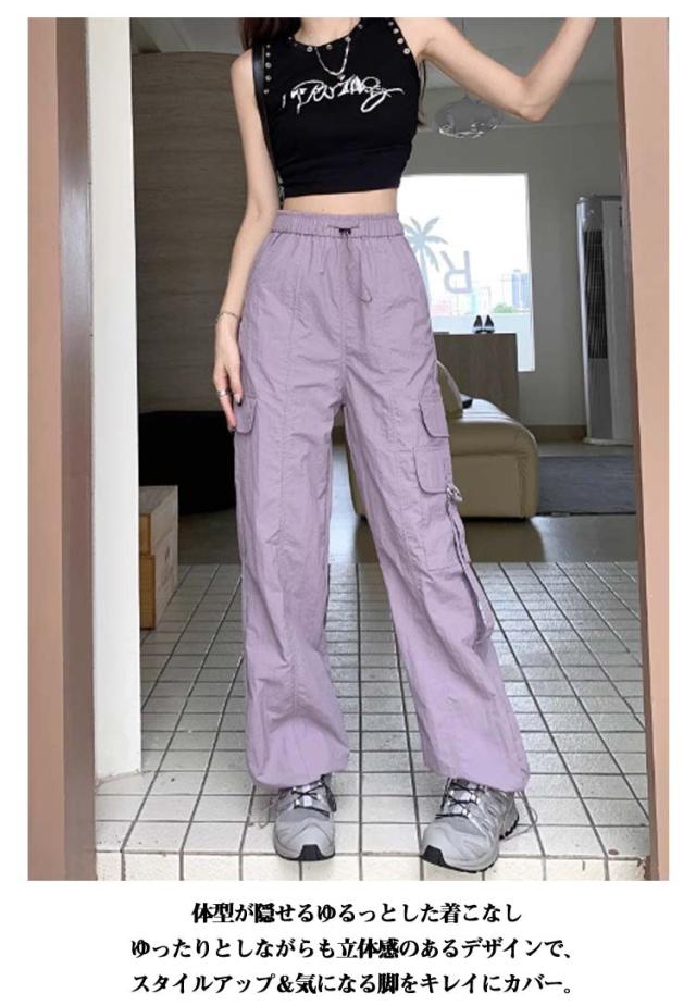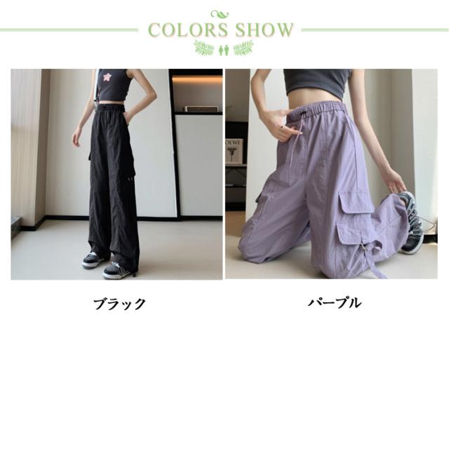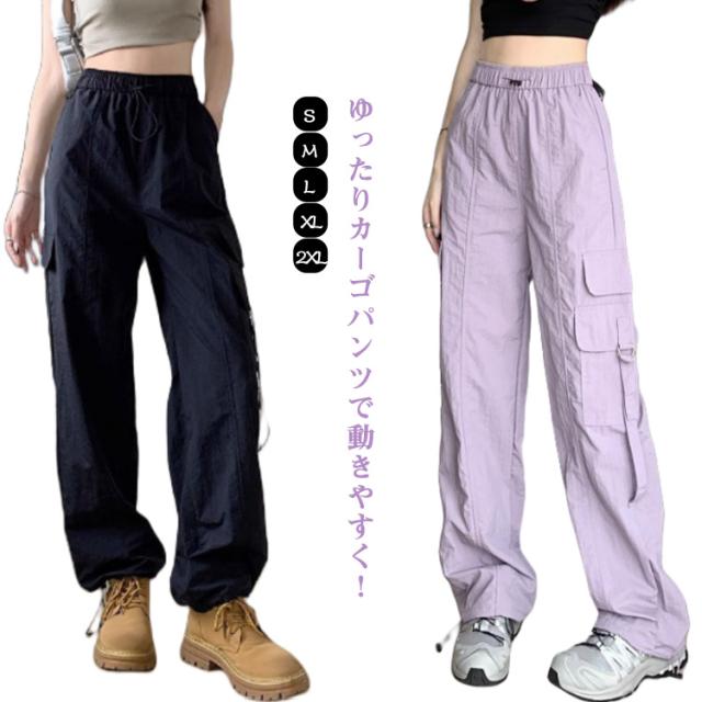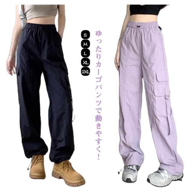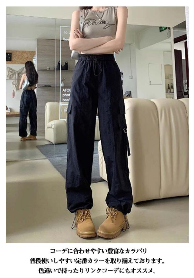 カーゴパンツ レディース ゆったり ワイド ルーズ ズボン ボトムス 黒 メンズライク 無地 楽 動きやすい 女性用 春 秋 薄手 10分丈 サイドポケット ウエストゴム ドローコード 調節 作業着 ストリート ストレート ゆったり カジュアル 送料無料