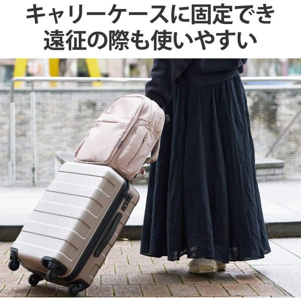 ●背面のキャリーベルトによって、キャリーケースにバッグを固定して使用可能。遠征の際も使いやすい設計です。