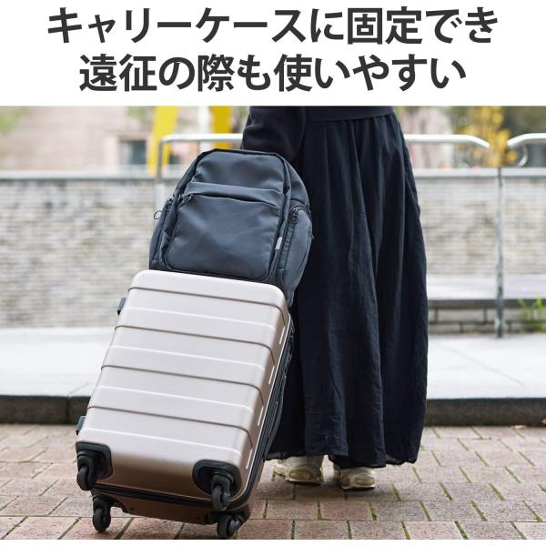 ●背面のキャリーベルトによって、キャリーケースにバッグを固定して使用可能。遠征の際も使いやすい設計です。