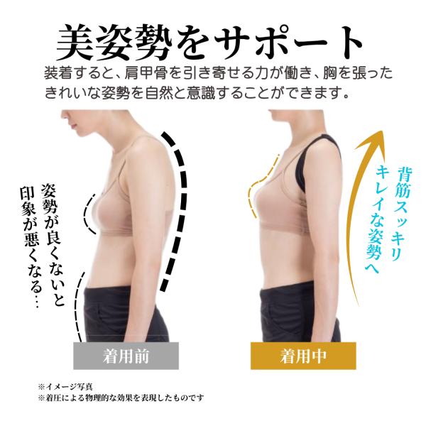 姿勢を正し、体幹を感じて引き締まったカラダへサポート! 内蔵されたクロスベルトが肩甲骨を中心に引き寄せることで、 体の軸(体幹)を意識。胸を張ったきれいな姿勢へと自然と導きます。 |