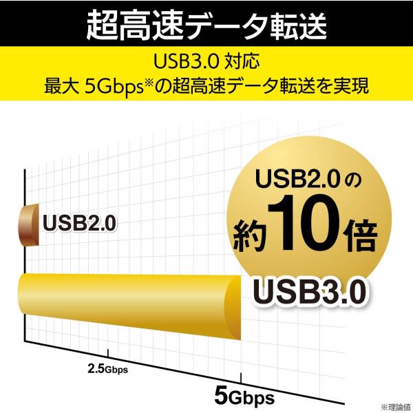 ・最大転送速度:USB3.0スーパースピード/5Gbps(理論値)、USB2.0ハイスピード/480Mbps(理論値)、USB1.1フルスピード12Mbps(理論値)