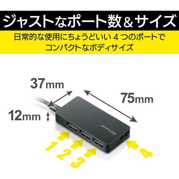 ・コネクタ形状:パソコン側(アップストリームポート):USB A(オス)×1、USB機器側(ダウンストリームポート):USB A(メス)×4