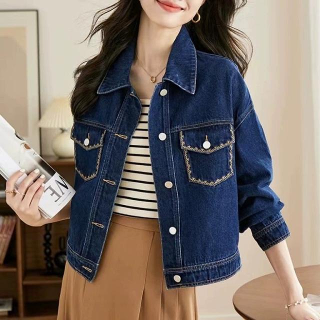 デニムジャケット レディース 長袖 デニム ショート丈 モード系 刺繍 アウター 羽織 前開き pLegLad店 カジュアル 大人女子 かわいい きれいめ ゆったり ブルー 春 秋 20代 30代