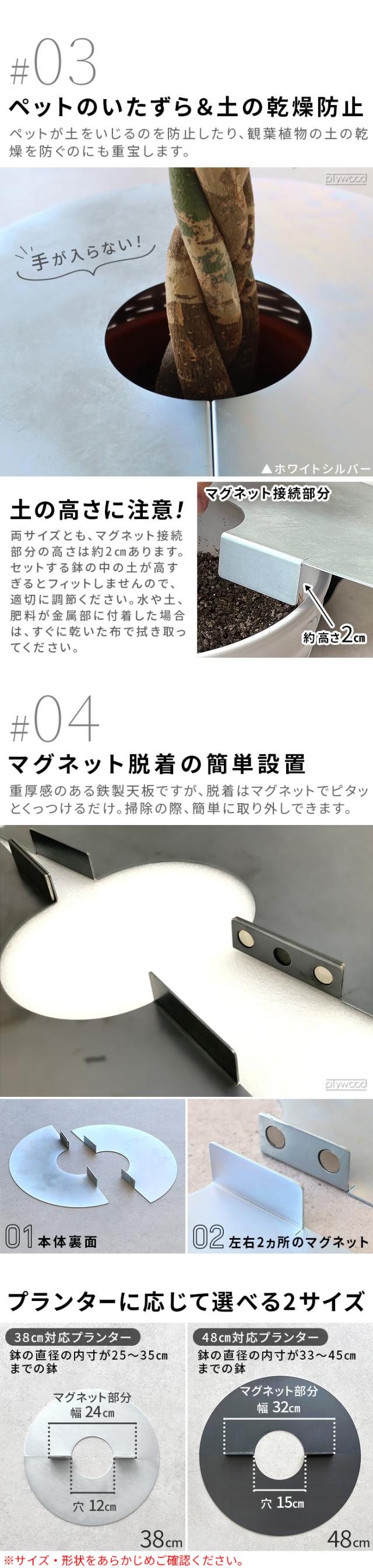 | ※ご希望のプランターに入らなかった場合の返品・交換は受け付けてません。必ず事前にサイズをご確認ください。 【よくあるご質問】 Q.どんな鉢にも対応していますか? A. 38cmサイズには内寸25.0-35.0cm までの鉢に対応可 48cmサイズには内寸33.0-45.0cmまでの鉢に対応可また脚部がしっかり乗る広さと安定感のある鉢を推奨します。形状やサイズが合わない鉢では、転倒のリスクがあります。 Q.天板がズレたり落ちたりしませんか? A. 通常使用ではマグネットで固定されていますが、安全のため、必ず設置時にズレの有無を確認してください。 Q. サビが心配です。 どうすればよいですか? A. 使用環境によりサビが出る場合があります。こまめな拭き取りと防錆剤の併用をおすすめします。 【使用方法】 [1]安定したプランター(鉢)をご用意ください。 ・本製品は、プランターの上部にかぶせて使用します。 ・脚部がきちんと乗るサイズ・形状か、あらかじめご確認ください。 [2]本体をプランターの上に設置します。 ・設置の際、必要に応じて滑り止めパッドやフェルトをご使用ください。 [3]天板を装着・脱着する際は、必ずプランターの上に本体が安定して置かれた状態で行ってください。 ・天板を円のまま持ち上げると、磁力の外れや本体の転倒につながり危険です。 ・脱着の際は、半円ごとにマグネットを外して取り外してください。 [4]設置後、上に小物(カップ、本など)を置いてご使用ください。 |