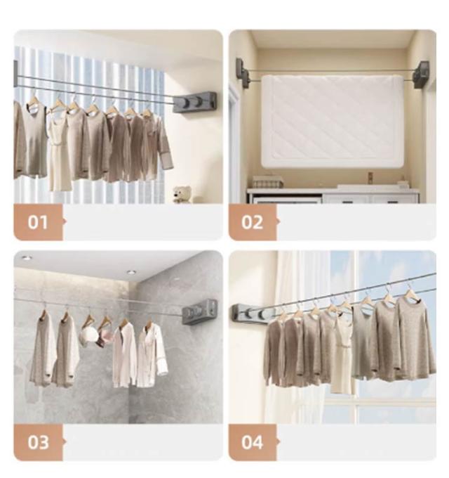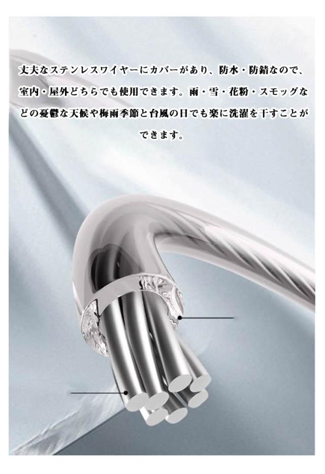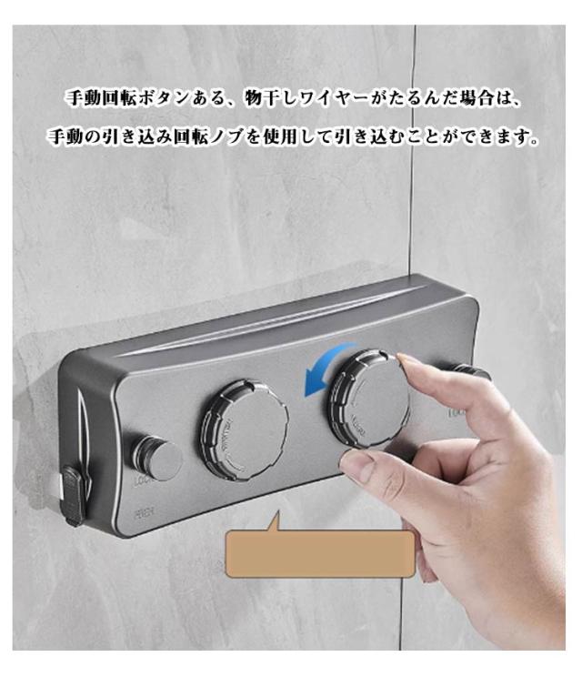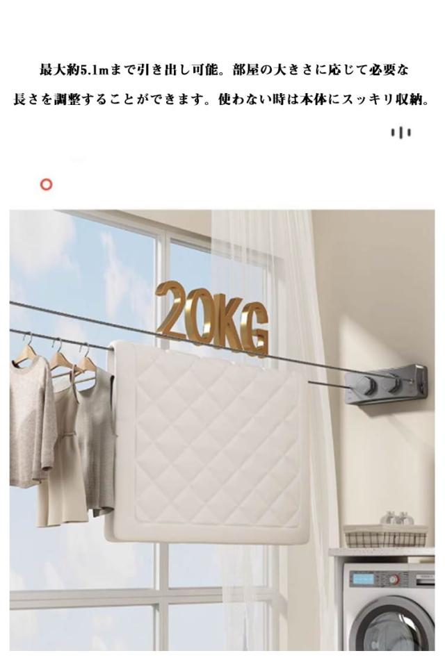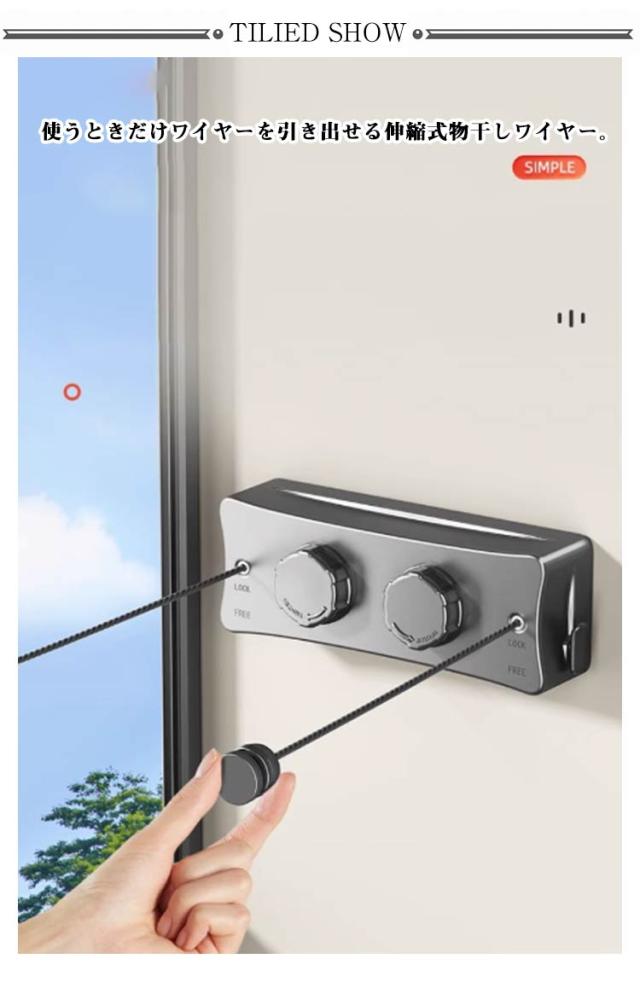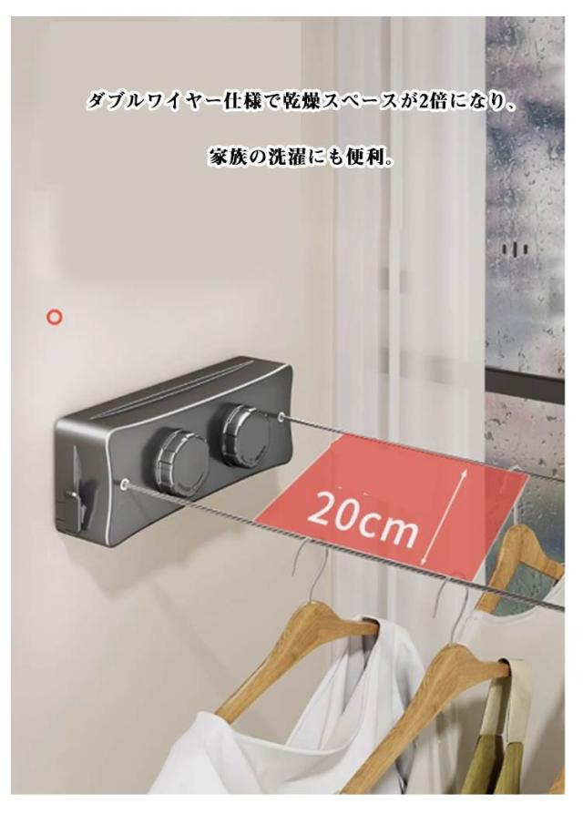| コンパクトに収納できる!ダブルワイヤー式室内物干し 使うときだけワイヤーを引き出せる伸縮式物干しワイヤー。 ダブルワイヤー仕様で乾燥スペースが2倍になり、家族の洗濯にも便利。 最大約5.1mまで引き出し可能。部屋の大きさに応じて必要な長さを調整することができます。使わない時は本体にスッキリ収納。 手動回転ボタンある、物干しワイヤーがたるんだ場合は、手動の引き込み回転ノブを使用して引き込むことができます。 丈夫なステンレスワイヤーにカバーがあり、防水・防錆なので、室内・屋外どちらでも使用できます。雨・雪・花粉・スモッグなどの憂鬱な天候や梅雨季節と台風の日でも楽に洗濯を干すことができます。 賃貸OK。開けなくても取り付けることができます。穴を開けずに接着剤での取り付けができ、壁を傷付けずお引越しも楽々です。穴を開け必要がある時、専用のネジを付属し、簡単に取り付けることができます。 滑らかなタイル・凹凸のタイル・滑らかな大理石・凹凸の大理石・滑らかなガラス・艶出しガラス(ガラスの強度を考慮する必要があり、慎重に使用してください)・滑らかな金属・凹凸の金属、無垢材の壁には穴あけ不要で取付可能。 塗装壁、壁紙、石膏壁、壁紙壁など壁は穴あけ向きの壁です。 | |