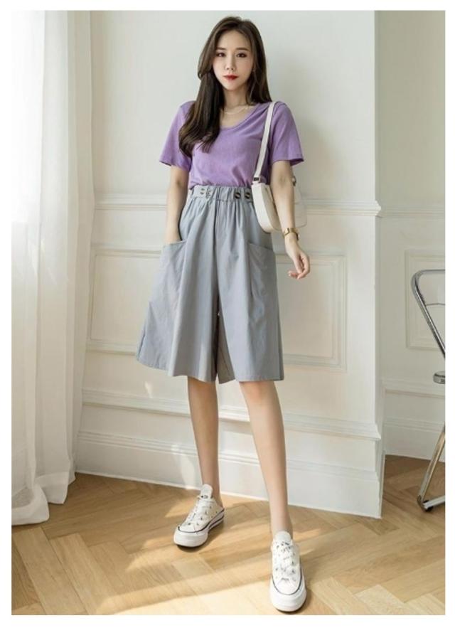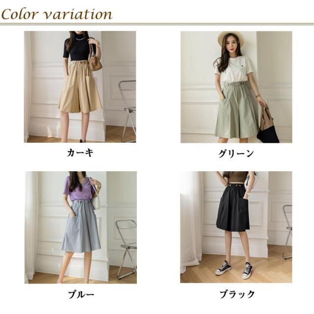 | 4colors(カーキ・グリーン・ブルー・ブラック) スカートのように見えるふんわりフレアショートパンツです。 キレイめすっきりなワイド キュロットパンツ。 膝丈のゆったりAラインシルエットで、脚が細く見える。 ハイウエストでスタイルアップ効果も。 両サイドにはポケットあり、実用性も抜群。 どんな時も心地よく、リラックスできるウェアと共に、充実した毎日を。 | |