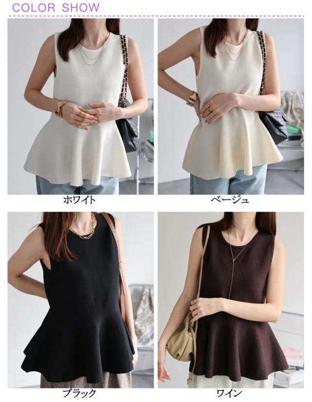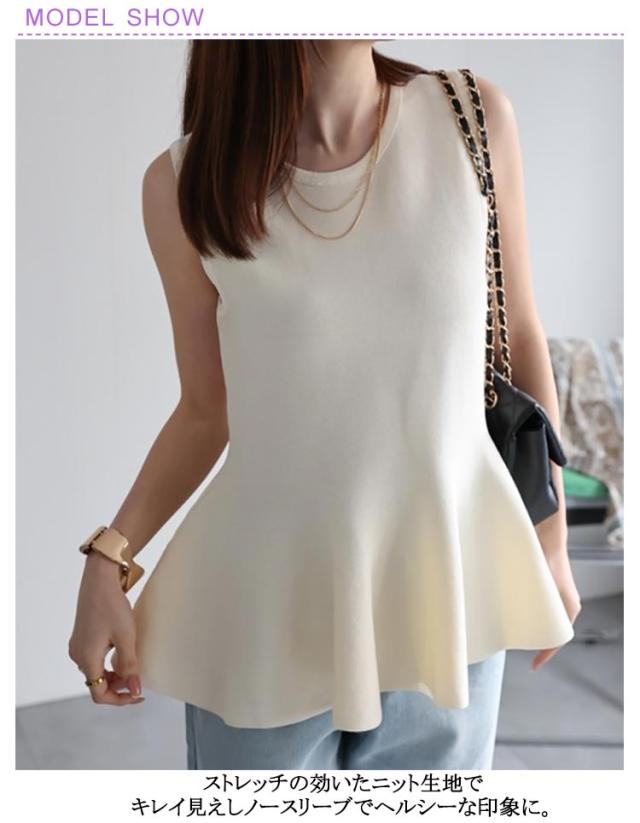 ペプラム ニット フレアトップス ペプラム きれいめい フレア フリル 春 トップス 秋 レディース ペプラムトップス ノースリーブトップス クルーネック プルオーバー ノースリーブニット 夏 ノースリーブ フィット サマーニット 大人 春夏 春