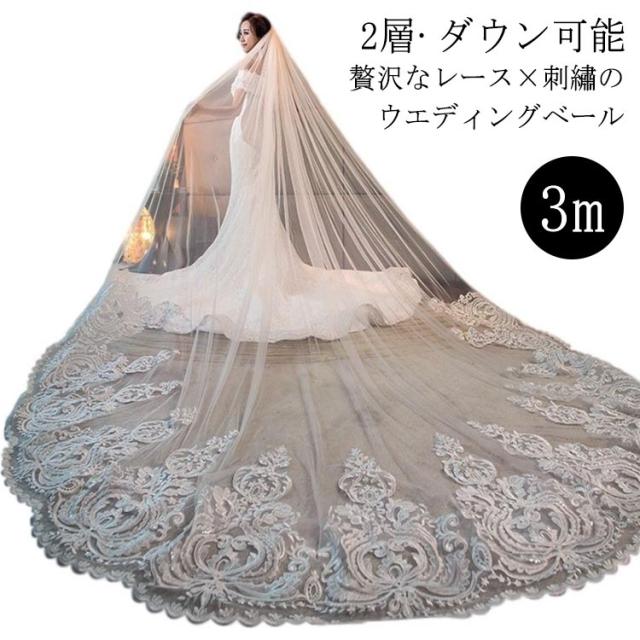 ダウン可能 ウエディングベール ロング エレガント 刺? 贅沢 ウェディング 2層 華奢 ベール おしゃれ ボリューム ロングベール ロングベール 高級感 コーム付 レース 花嫁 ヘッドドレス ヘアアクセサリー 髪飾り 結婚式 披露宴 パーティー 前撮り ホワイト オフホワイト