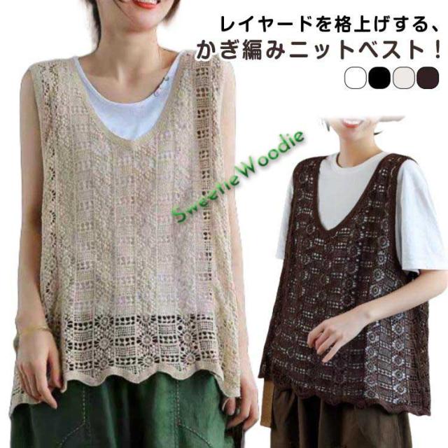 送料無料 ベスト レディース 春夏 ニットベスト 透かし編み クロシェ編み トップス プルオーバー Vネック かぎ編み レース 花柄 ノースリーブ サ
