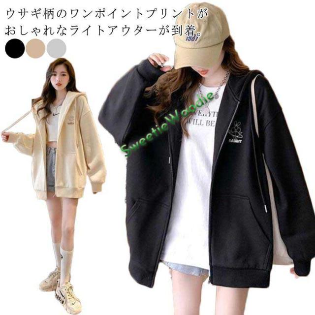 スウェットパーカー ジップアップパーカー 薄手 レディース パーカー スウェット ワンポイント ウサギ うさぎ 柄 オーバーサイズ アウター 羽織り