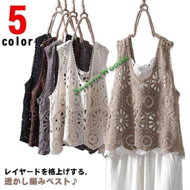ベスト レディース 春夏 透かし編み クロシェ編み トップス プルオーバー かぎ編み カジュアル ニットベスト 綿 おしゃれ 無地 レイヤード きれい