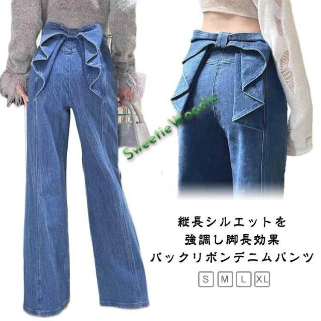 ワイドパンツ 冬 デニムパンツ カジュアル 春 着回し 30代 すっきり ジーパン ガーリー ママ ヴィンテージ ルーズ バックリボンデニム 韓国 4