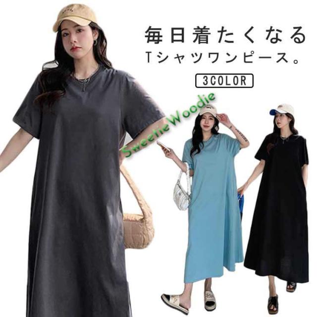 送料無料 ポケット付き Tシャツワンピース 半袖 tシャツ ワンピース レディース ロングワンピース マキシワンピース 丸首 フレア Aライン 体型カ