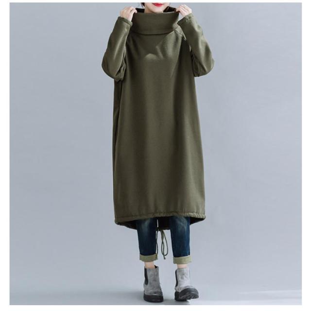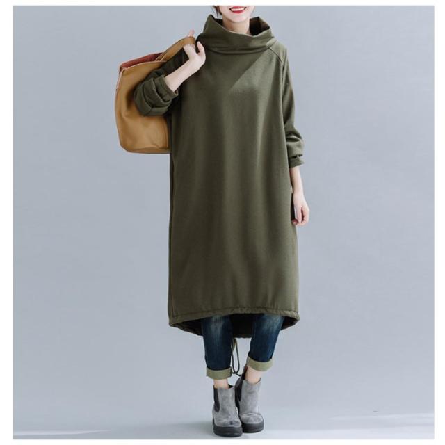 | あったかな裏ボアロングワンピース。 ボリュームのあるハイネックdesignが首元も暖かくなります。高すぎないボトルネックがスマートな顔周りを演出して、防寒効果も◎ フロント裾はバック裾より少し短くて、大人女性らしいスタイルに 秋冬を彩って、ふわふわ・もこもこの暖かい裏ボア素材使いで全身をすっぽりと包んでくれます。 ゆったりとしたdesign×膝下の丈感も着やすい。 定番のグリーン、グレー、ブラックの3色を用意します。 ジーンズなどのスキニーパンツと合わせて、暖かくおしゃれな秋冬コーデが完成! | |