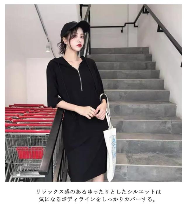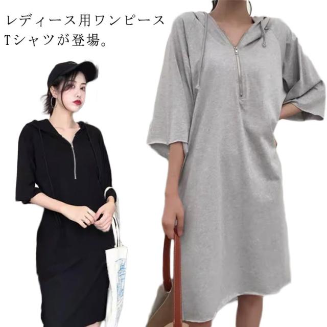 tシャツ レディース 夏 トップス ワンピースTシャツ フード付 シンプル ビッグtシャツ ロングTシャツ 春夏 5分袖 オーバー 春 夏 カットソー ワンピース 無地 五分袖 ビッグシルエット Tシャツ 大きいサイズ トレーニング