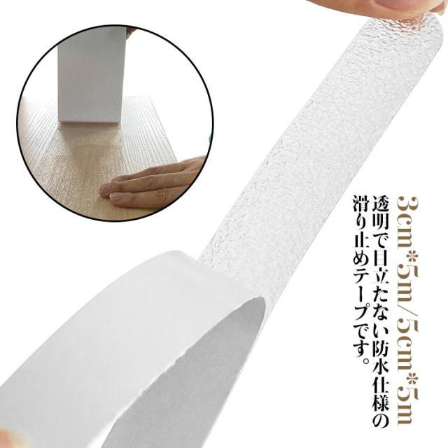| 透明で目立たない防水仕様の滑り止めテープです。 強力な粘着力でしっかり固定でき、耐久性にも優れているため、屋内外問わず使用可能。 階段やスロープ、玄関などの滑りやすい場所に最適で、安全な歩行をサポートします。 防水仕様なので、浴室やキッチンなどの水回りにも最適です。 選べる幅は3cm、5cmの2種類で、用途に応じて調整可能。 透明デザインでインテリアを損なわず、安全対策ができる便利なアイテムです。 | |
