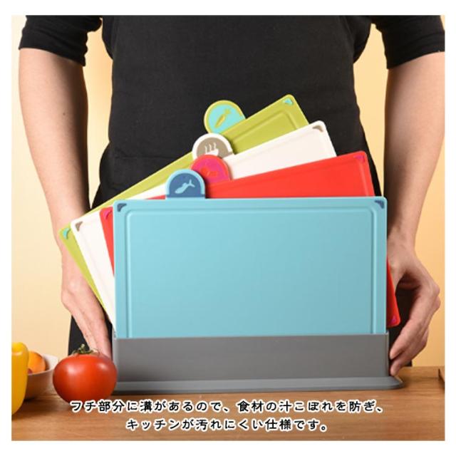 | 素材に合わせて使い分けが出来る、うれしい4枚セットです。【スタンド付き】 野菜・肉魚・薬味など、食材に合わせて使い分けしやすいまな板セット。 フチ部分に溝があるので、食材の汁こぼれを防ぎ、キッチンが汚れにくい仕様です。 四つの角には滑り止めになっているため、調理台の上でも滑らず安定して使えます。 まな板はリバーシブル仕様です。 軽いため、食材を鍋などに移すのも楽々。 | |