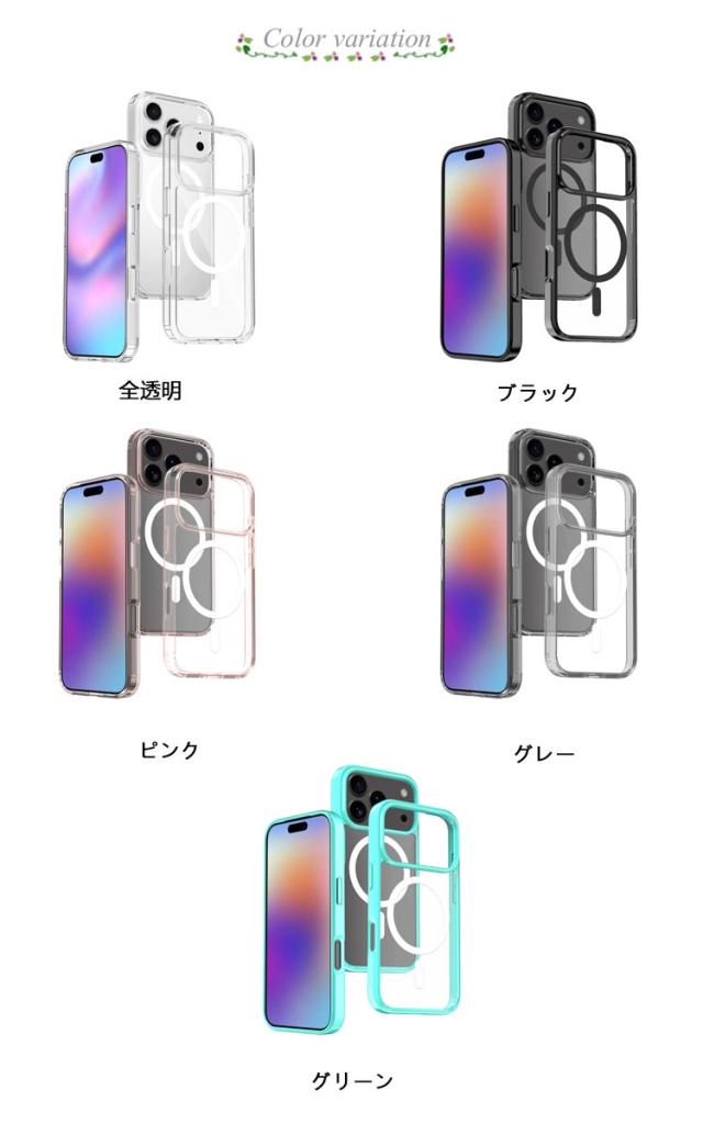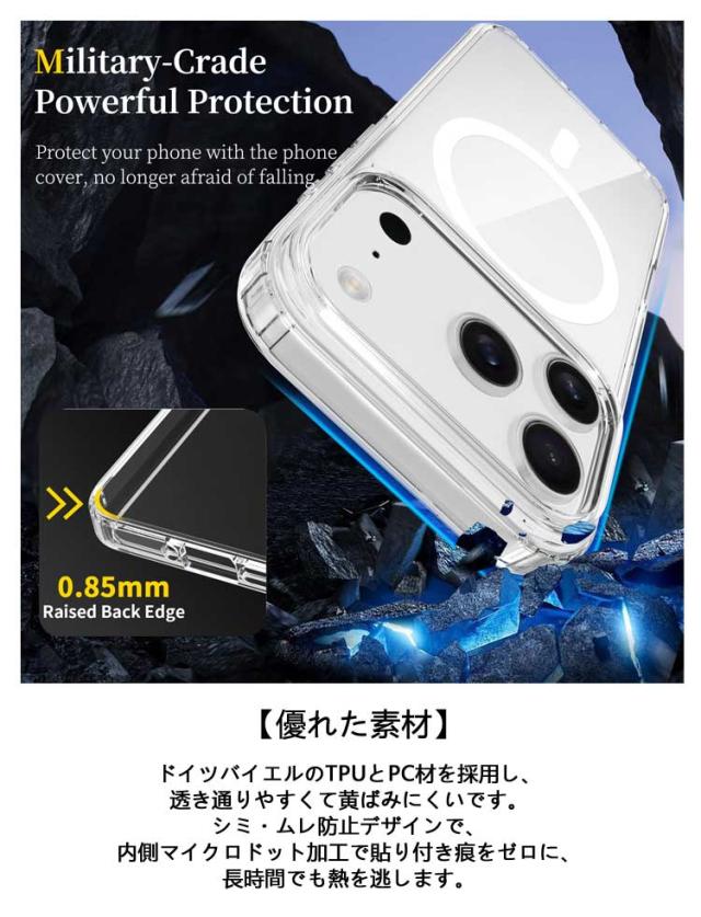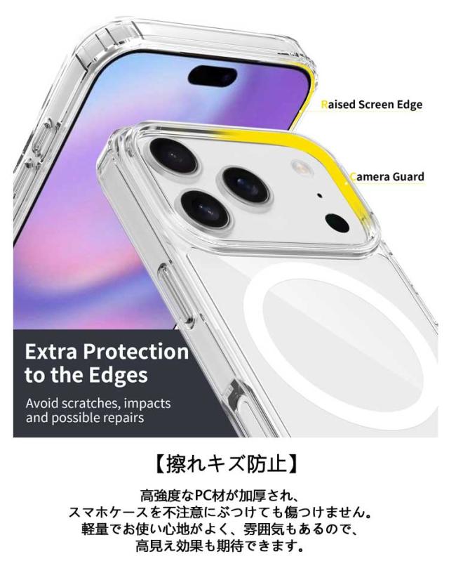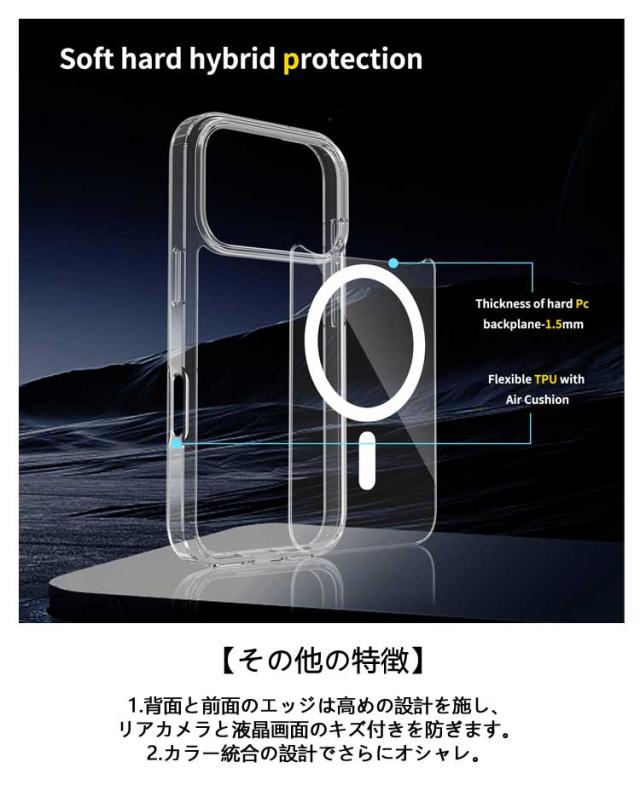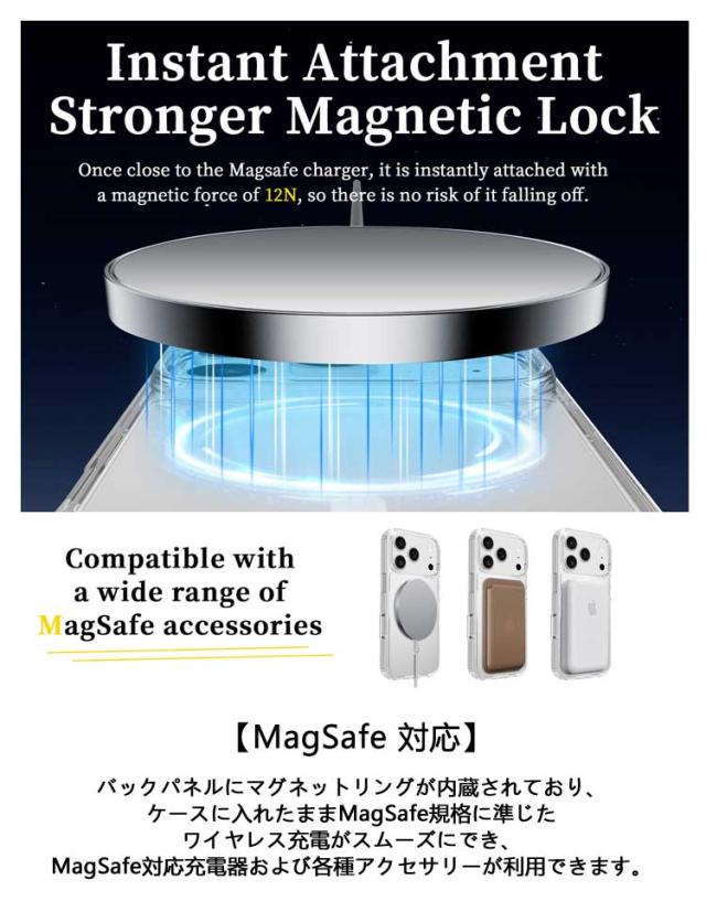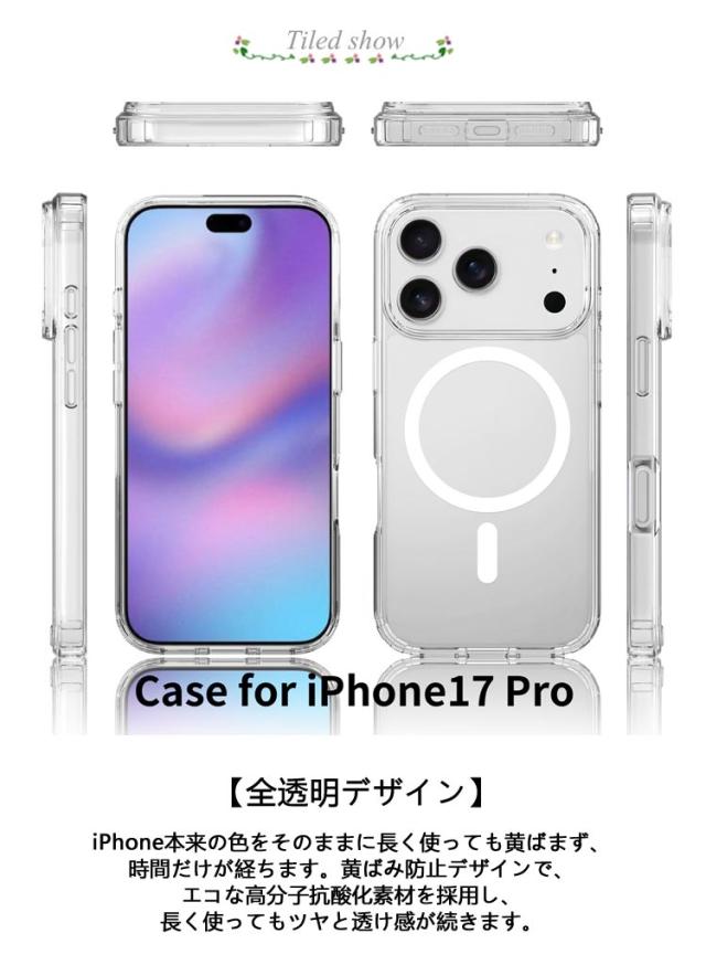 | MagSafe対応 全透明 iPhone17/16/15/14/13保護ケース 【MagSafe 対応】バックパネルにマグネットリングが内蔵されており、ケースに入れたままMagSafe規格に準じたワイヤレス充電がスムーズにでき、MagSafe対応充電器および各種アクセサリーが利用できます。ケースを外すことやケーブルの差し込みなどの手間が省けるので、MagSafe充電の便利さをそのまま楽しめます。さらに、強力な磁気吸引力があり、充電時の位置ずれ問題も完璧に改善されました。 【全透明デザイン】iPhone本来の色をそのままに長く使っても黄ばまず、時間だけが経ちます。黄ばみ防止デザインで、エコな高分子抗酸化素材を採用し、長く使ってもツヤと透け感が続きます。 【優れた素材】ドイツバイエルのTPUとPC材を採用し、透き通りやすくて黄ばみにくいです。シミ・ムレ防止デザインで、内側マイクロドット加工で貼り付き痕をゼロに、長時間でも熱を逃します。 【擦れキズ防止】高強度なPC材が加厚され、スマホケースを不注意にぶつけても傷つけません。軽量でお使い心地がよく、雰囲気もあるので、 高見え効果も期待できます。 【誤操作防止設計】独立ボタン設計で、まるでケースを付けてない使い心地、こだわった加工が押しやすくて誤動作を防止します。汗残りにくく、手触り最強、日常生活に最適です。 【その他の特徴】 1.背面と前面のエッジは高めの設計を施し、リアカメラと液晶画面のキズ付きを防ぎます。 2.カラー統合の設計でさらにオシャレ。 | |