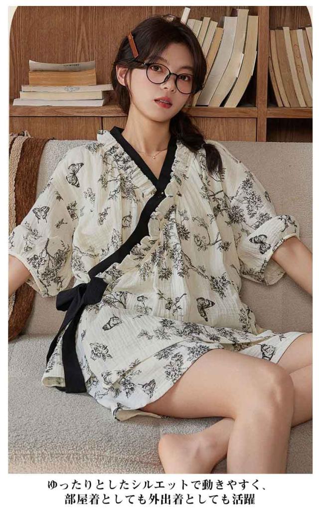 | カップ付きで楽に着られる甚平パジャマ Vネックと和服風デザインが女性らしい雰囲気を演出 カップ付きデザインで下着いらず、リラックスして着られるレディースパジャマセット。 軽量で通気性の高い生地を使用し、春夏シーズンに快適な着心地を提供。 ゆったりとしたシルエットで動きやすく、部屋着としても外出着としても活躍 半袖トップスと短パンの上下セットは旅行やお泊まりにもおすすめ。 | |