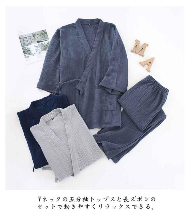 カップル 寝間着 レディース 部屋着 春 綿 長ズボン 甚平 上下セット 夏 秋 ペアルック 軽量 通気性 甚平 薄手 五分袖 吸汗 くしゅくしゅ生地 Vネック ゆったり ルームウェア ナイトウェア シンプル リラックスウェア M L XL