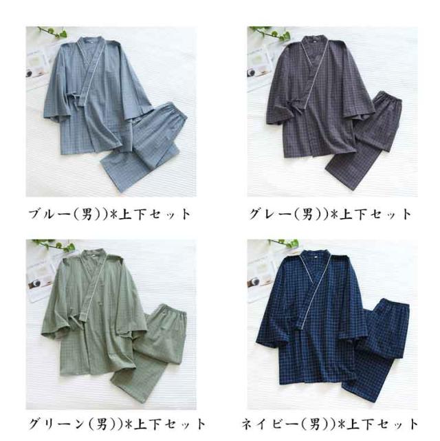 甚平 M 上下セット 春 綿 チェック柄 メンズ 通気性 薄手 秋 夏 和風パジャマ ルームウェア ピンク 軽量 ゆったり 肌に優しい 敏感肌向け 快適 L XL 大きいサイズナイトウェア 無地 チェック柄 グリーン ブルー ネイビー