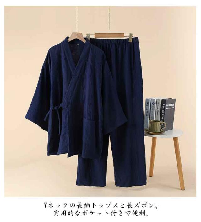 甚平 長袖 ナイトウェア Vネック 大きいサイズ 春 秋 上下セット 薄手 長ズボン ポケット付き 綿 通気性 吸汗 夏 メンズ ゆったり ルームウェア 軽量 旅館 ホテル 温泉 シンプル リラックスウェア 着脱簡単 入院 お泊り 旅行