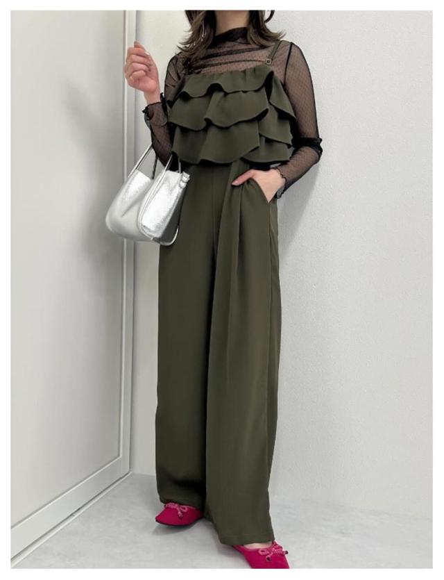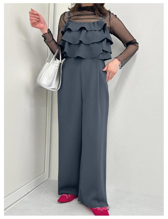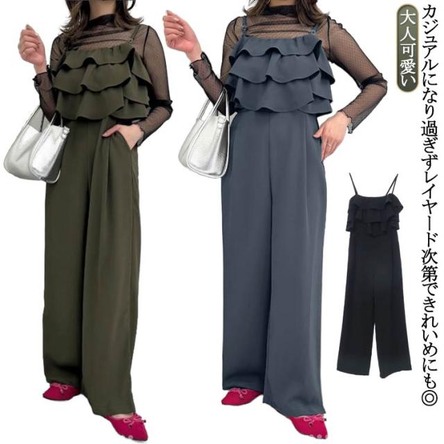 オールインワン サロペット キャミソール ティアード オールインワン レディース ベアトップ フリル キャミ ワイドパンツ きれいめ 大人 ポケット パンツ ワイド ストレート セットアップ サロペットパンツ ハイウエスト 春夏 春 夏 秋