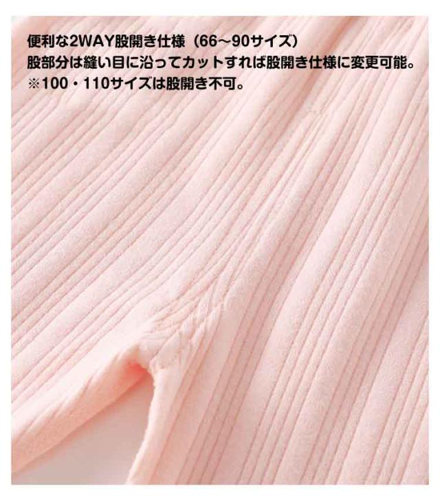 | ベビー 長袖ルームウェア 赤ちゃんの敏感肌にも優しい、柔らかく通気性の良いコットン素材。 快適デザイン 丸首+肩スナップボタンで着替えラクラク。お腹を守る腹巻き設計で冷え対策。 便利な2WAY股開き仕様(66〜90サイズ) 股部分は縫い目に沿ってカットすれば股開き仕様に変更可能。※100・110サイズは股開き不可。 無縫製仕上げでチクチクせず快適。袖口・裾口はゴム入りでずり落ち防止。 | |