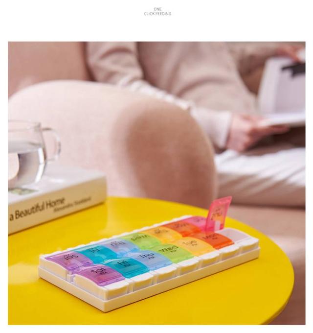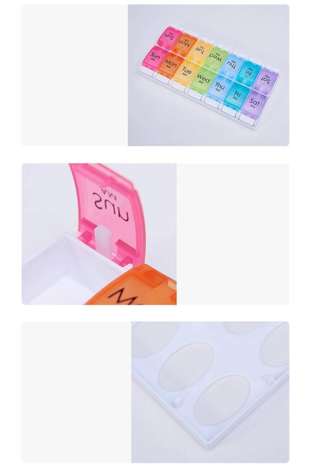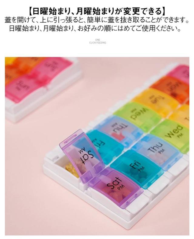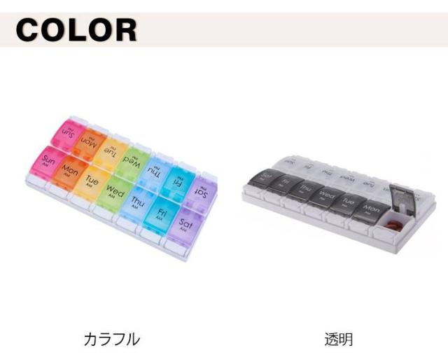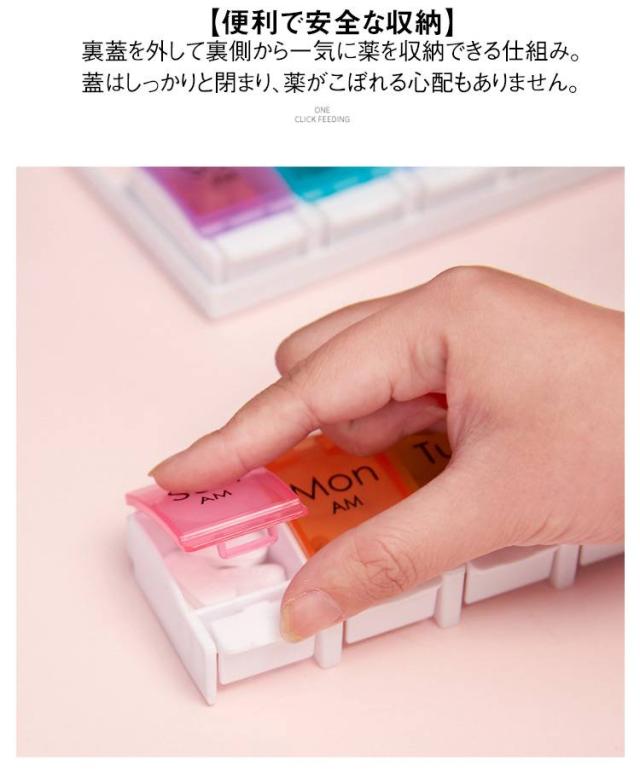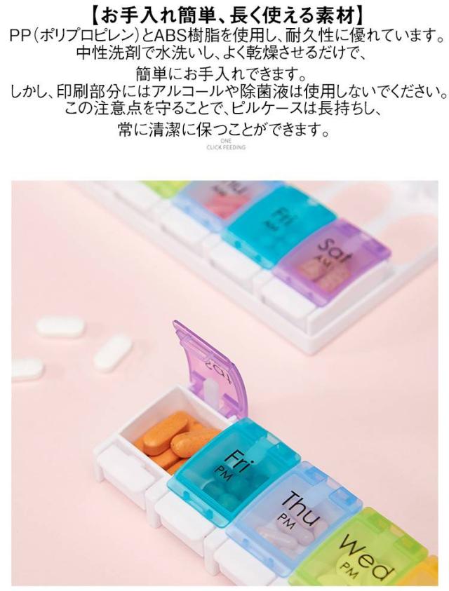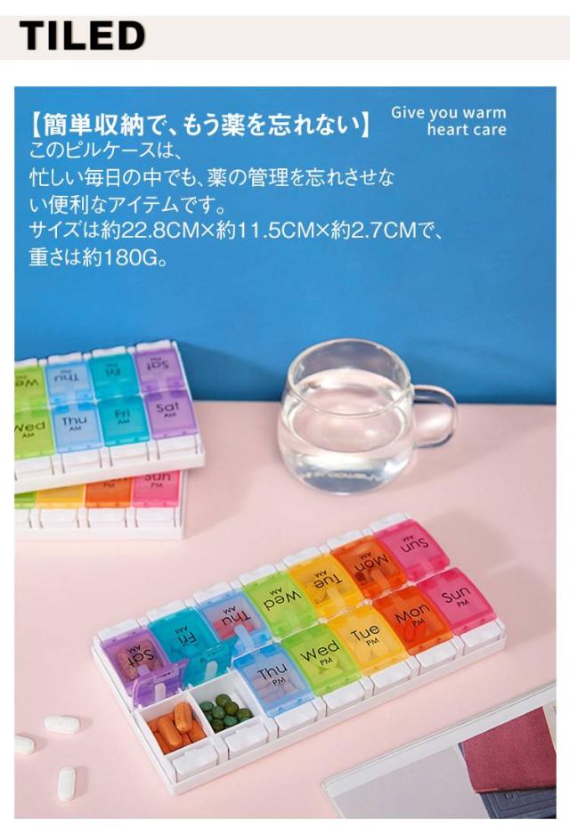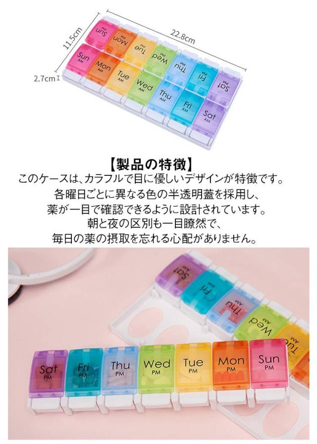 | ピルケース 一週間/一日2回用 2色 【簡単収納で、もう薬を忘れない】 このピルケースは、忙しい毎日の中でも、薬の管理を忘れさせない便利なアイテムです。 サイズは約22.8cm×約11.5cm×約2.7cmで、重さは約180g。 バッグに入れても邪魔にならないサイズ感で、どこにでも持ち運べます。 【製品の特徴】 このケースは、カラフルで目に優しいデザインが特徴です。 各曜日ごとに異なる色の半透明蓋を採用し、薬が一目で確認できるように設計されています。 朝と夜の区別も一目瞭然で、毎日の薬の摂取を忘れる心配がありません。 【便利で安全な収納】 裏蓋を外して裏側から一気に薬を収納できる仕組み。 蓋はしっかりと閉まり、薬がこぼれる心配もありません。 【お手入れ簡単、長く使える素材】 PP(ポリプロピレン)とABS樹脂を使用し、耐久性に優れています。 中性洗剤で水洗いし、よく乾燥させるだけで、簡単にお手入れできます。 しかし、印刷部分にはアルコールや除菌液は使用しないでください。 この注意点を守ることで、ピルケースは長持ちし、常に清潔に保つことができます。 【日曜始まり、月曜始まりが変更できる】 蓋を開けて、上に引っ張ると、簡単に蓋を抜き取ることができます。 日曜始まり、月曜始まり、お好みの順にはめてご使用ください。 | |