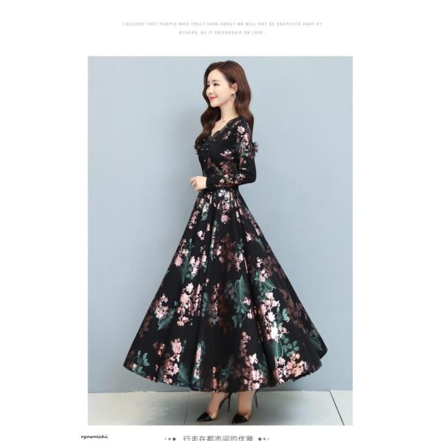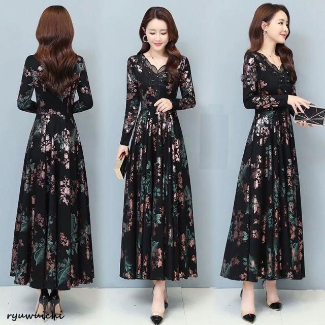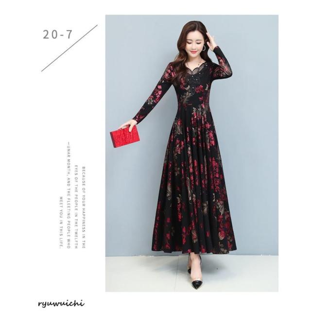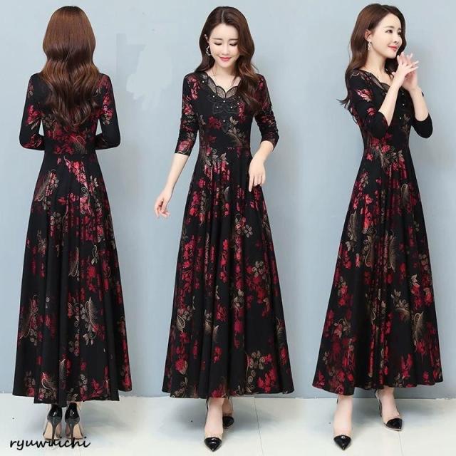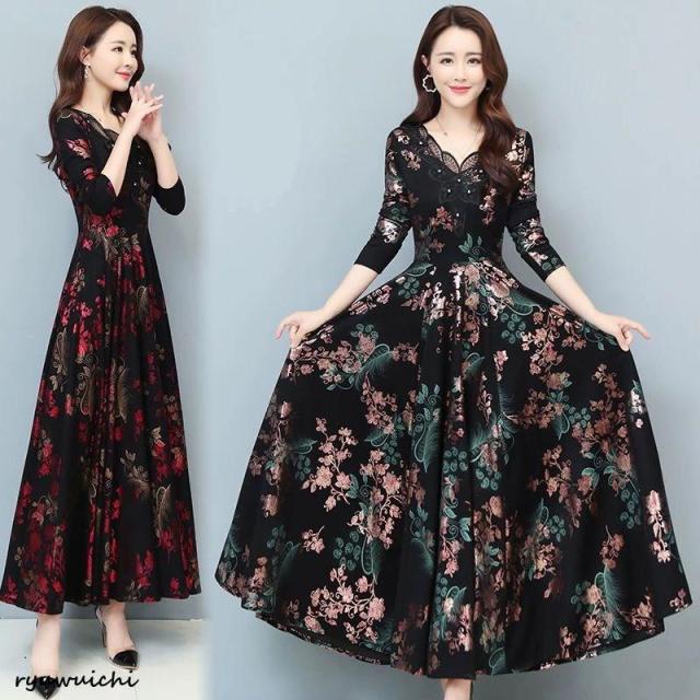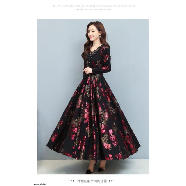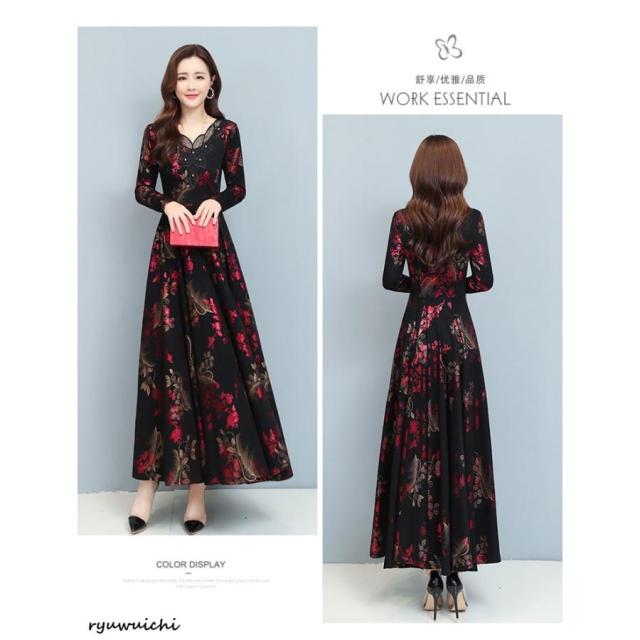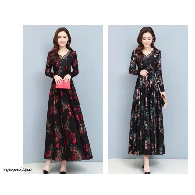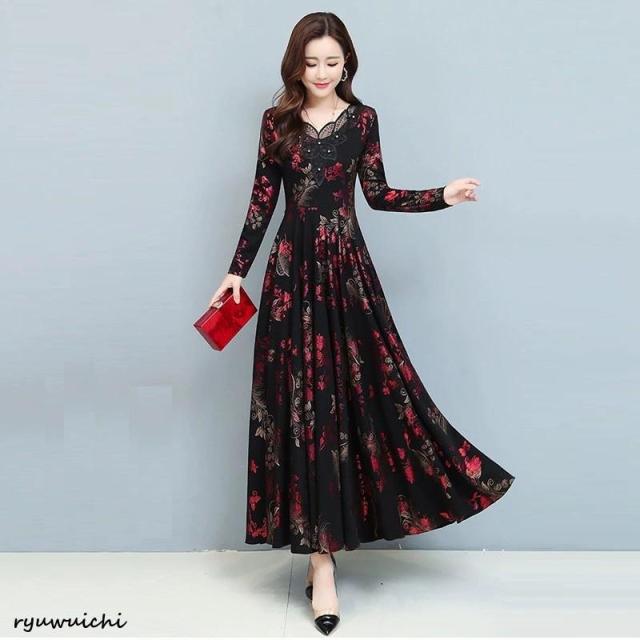 ワンピース 花柄 長袖 ウエスト切替 ファスナー ロングワンピース セレブコーデ 母親 卒園式 学校行事 ディナー ワインイベント お呼ばれ 演奏会