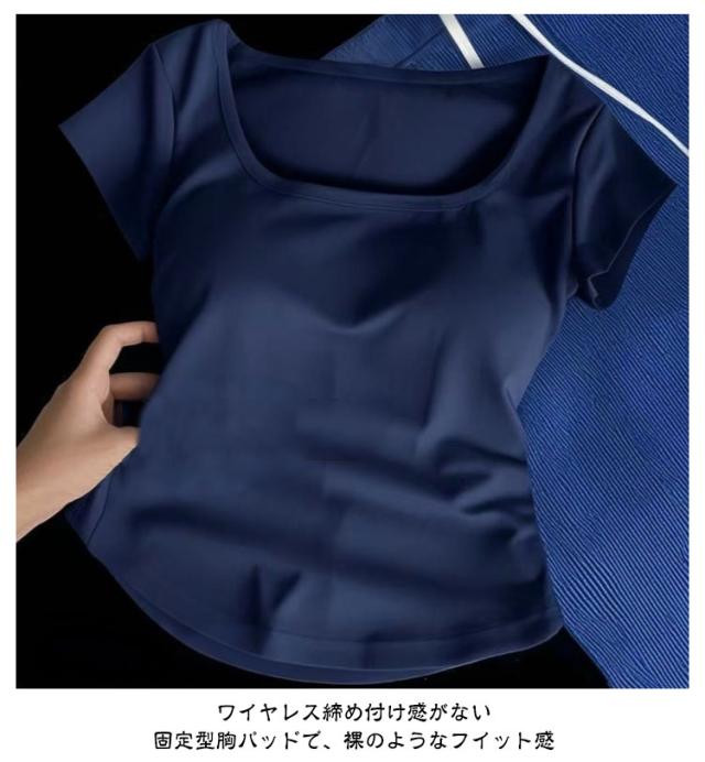 レディース スクエアネック 半袖 カップ付き スクエアカラートップス ブラトップ Tシャツ タイトフィット カップ付きtシャツ トップス 無地 Tシャツ ショート丈 パッド付き フィット感 カジュアル おしゃれ ネイビー 黒