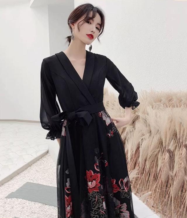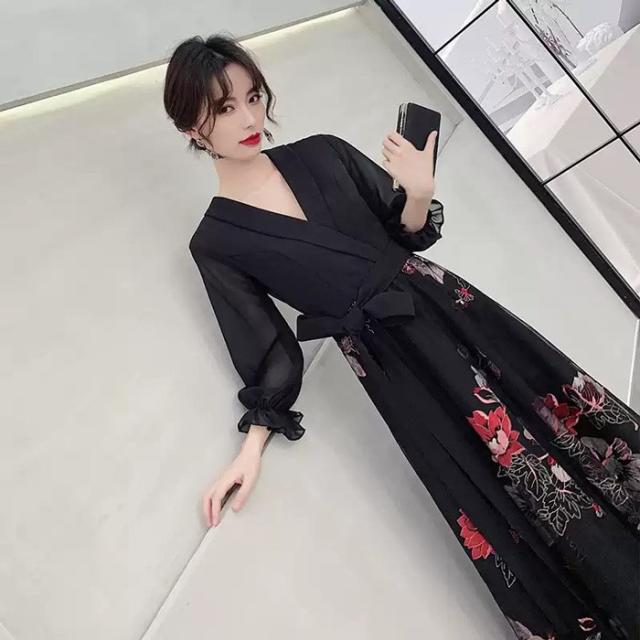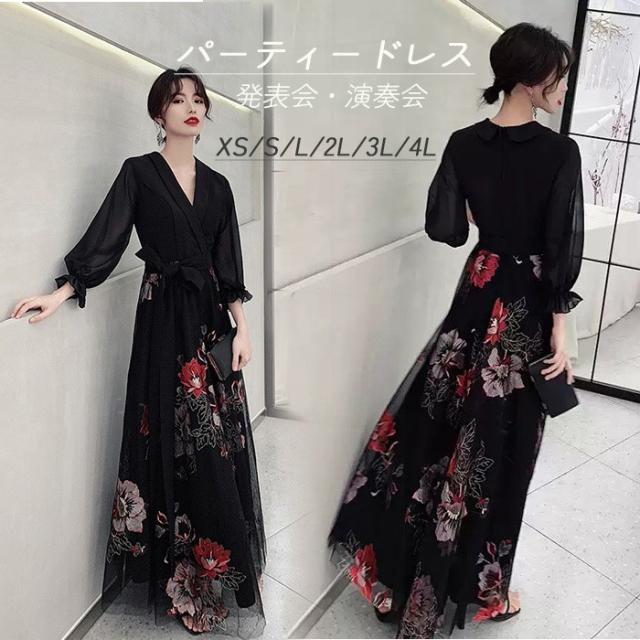 パーティードレス かっこいい 個性的 ロング 黒 袖あり 花柄 レース 大きいサイズ きれいめ 透け感 長袖 韓国 演奏会 ロングドレス フォーマル 結婚式 二次会 お呼ばれ ドレス Aライン ボタニカル シフォン Vネック カシュクール 大人可愛い