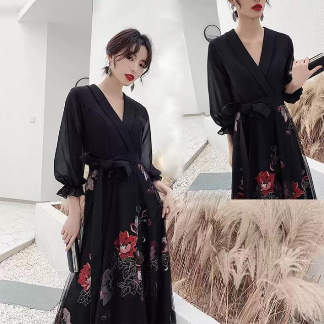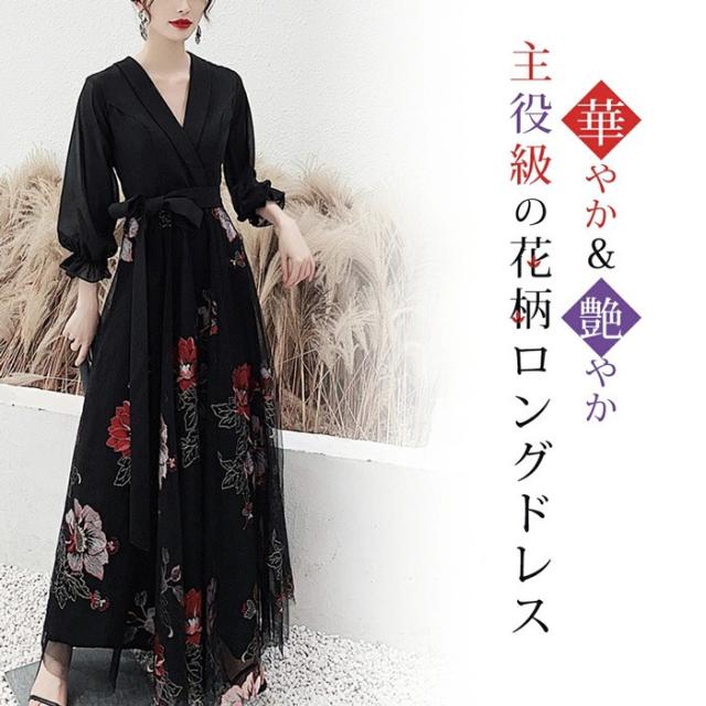 パーティードレス かっこいい 個性的 ロング 黒 袖あり 花柄 レース 大きいサイズ きれいめ 透け感 長袖 韓国 演奏会 ロングドレス フォーマル 結婚式 二次会 お呼ばれ ドレス Aライン ボタニカル シフォン Vネック カシュクール 大人可愛い dd121x0x0m6