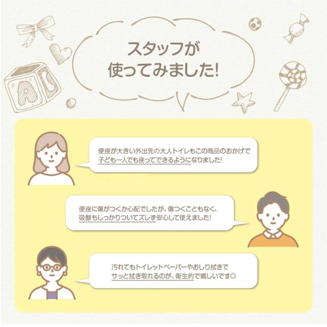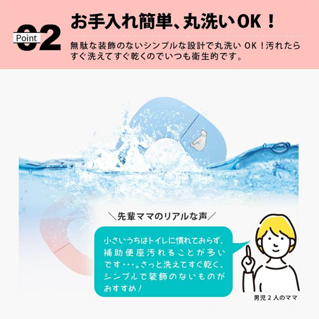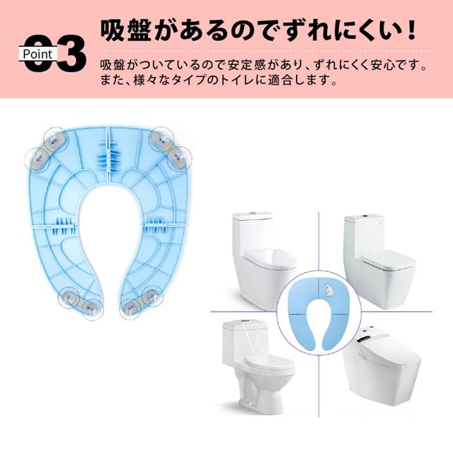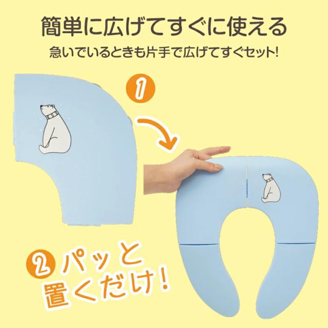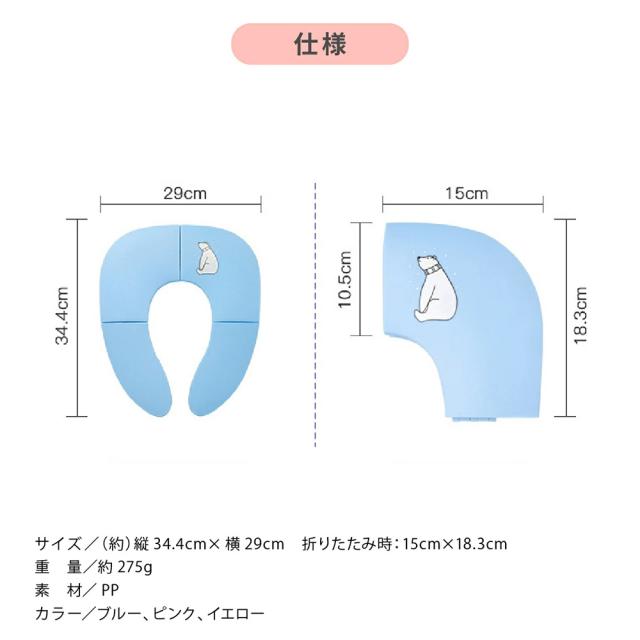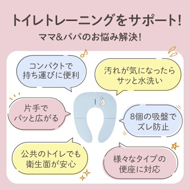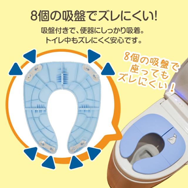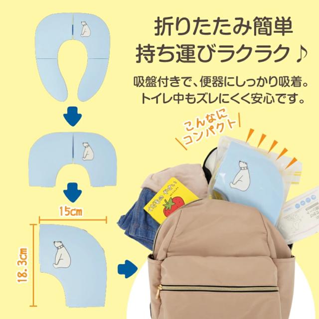 持ち運びに便利な子供用補助便座。コンパクトに折畳み可能なので使い勝手抜群です。普段のお出かけにはもちろん旅行時等にも大活躍。吸盤固定式でズレる心配もありません。汚れても丸洗い可能なので衛生面も安心。重さも275gと軽量なので普段使いのカバンに入れてお子様とのお出かけにも安心して行けますね。【サイズ】使用時:約34.4cm×29cm折り畳み時:約10.5cm×15cm×18.3cm