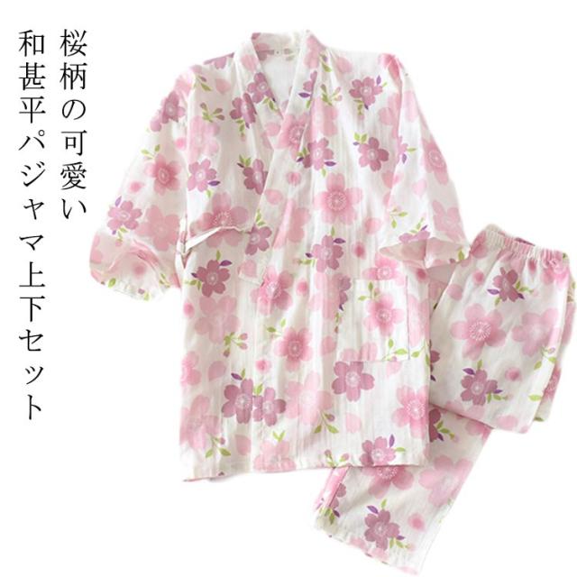 春夏秋 桜柄 上下セット 桜柄 五分袖 浴衣パジャマ 綿 ダブルガーゼパジャマ 甚平 レディース Vネック ピンク リボン付き 薄手 通気性 かわいい ゆったり M L XL 長ズボン ルームウェア