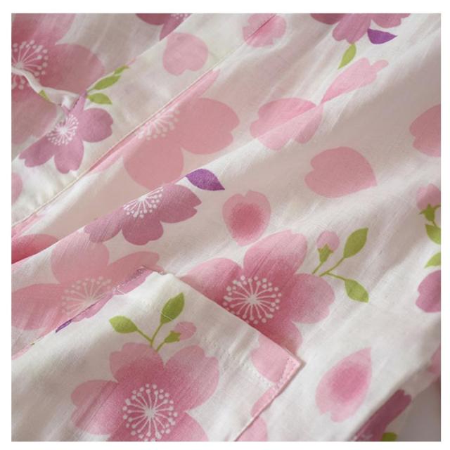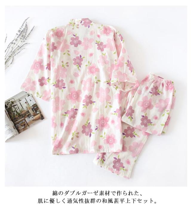 | 桜柄の可愛い和甚平パジャマ上下セット 軽くて着心地抜群、春秋に最適 綿のダブルガーゼ素材で作られた、肌に優しく通気性抜群の和風甚平上下セット。 春秋シーズンにぴったりな軽くて薄手の五分袖トップスと長ズボンのセット。 桜の美しい柄と甘さを感じるピンクカラーで女性らしいデザイン。 Vネックのリボン付きで着脱が簡単、ゆったりしたシルエットで快適な着心地。 実用的なポケット付きで、部屋着としても便利。 | |