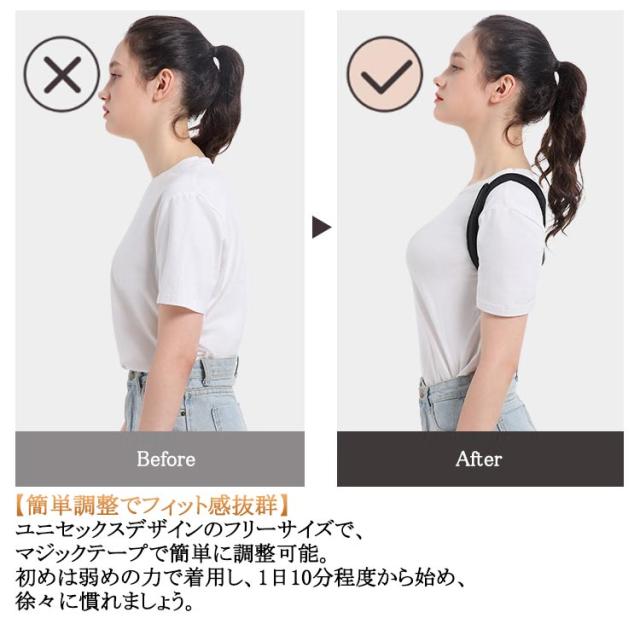 | 【美しい姿勢のサポート】 長時間のデスクワークやスマホの使用で気になる身体の歪みを整える姿勢サポーター。肩を開いて正しい姿勢を自然に意識させます。 【快適な通気性】 ソフトな素材とメッシュ加工で、ムレを防ぎながら伸縮性があり、長時間着用しても快適です。 【簡単調整でフィット感抜群】 ユニセックスデザインのフリーサイズで、マジックテープで簡単に調整可能。初めは弱めの力で着用し、1日10分程度から始め、徐々に慣れましょう。 【便利でコンパクト】 軽量でコンパクトな構造は持ち運びに便利で、どこでも簡単に着用できます。 【長時間の快適さ】 長時間の快適な着け心地を実現するために通気性と伸縮性に優れた素材を使用。簡単に洗濯できていつでも清潔に保てます。 【注意事項】 当製品は医薬品、医療機器ではございません。予めご了承くださいませ。 | |