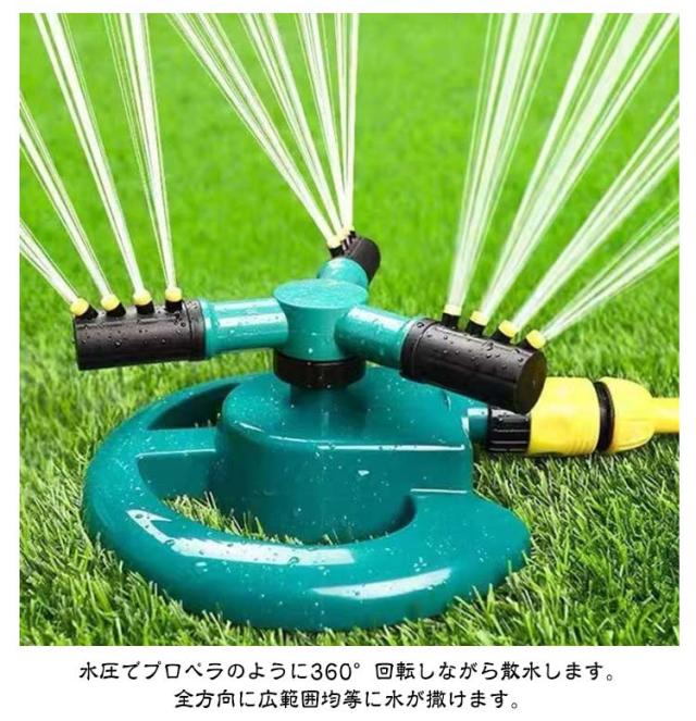 | 回転スプリンクラー 360°回転 全方向カバー。水圧でプロペラのように360°回転しながら散水します。全方向に広範囲均等に水が撒けます。 3箇所の先端ノズル、各4つの散水口。 家庭、庭園、庭園、道路、温室効果と冷却に適した芝生、農業、保育園、芝生の灌漑に使用できます。 子供の遊びにも使えます。 スピンして、あなたの子供たちに面白い遊びをさせてください! | |