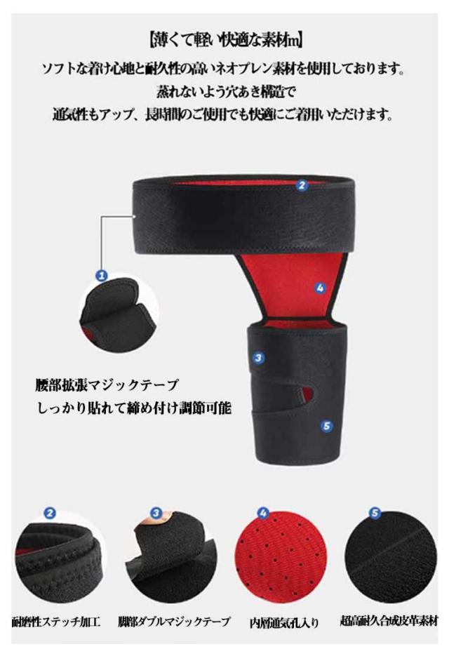 | 【人間工学に基づいた設計】 骨盤周りを引き締めて、ずれた股関節を引き寄せる事で痛みや歩行を助けます。 人体の構造に基づいてしっかりと設計されています。 【普段の歩行を徹底サポート】 歩行時の痛みや立ち座り、階段の上り下りや股など、痛めてしまった股関節を しっかりと固定し保護する事で歩行や体の動きをサポートします。 【体にフィット】 腰回りや太もも部分がマジックテープ式となっておりますので、ご自身の体に合わせて 締め付け具合を調整する事が可能です。 【薄くて軽い快適な素材】 ソフトな着け心地と耐久性の高いネオプレン素材を使用しております。 蒸れないよう穴あき構造で通気性もアップ、長時間のご使用でも快適にご着用いただけます。 | |