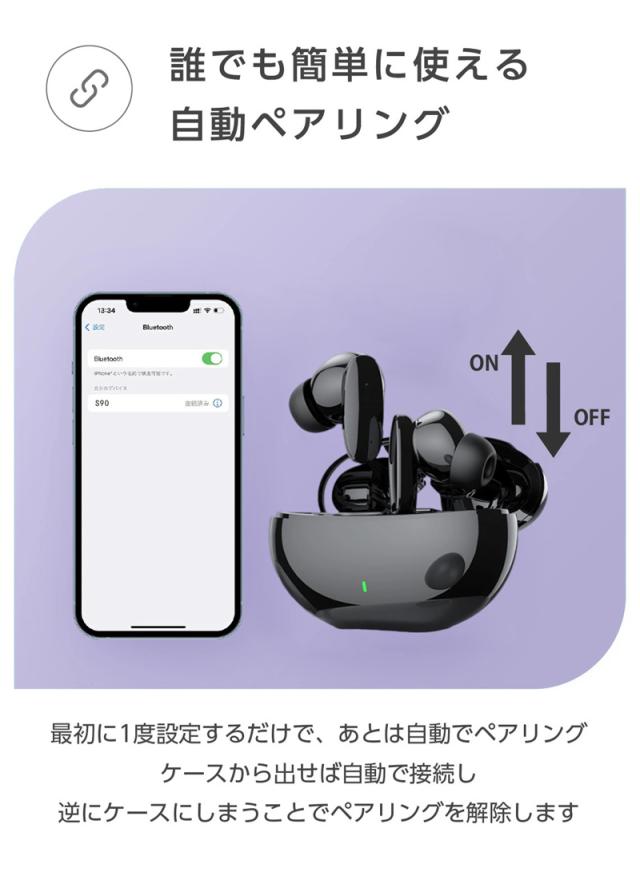 ■型番:s90 ■通信方式:Bluetooth 5.4 ■通信距離:10 ■プロフィル:A2DP/AVRCP/HFP/HSP ■片側イヤホン重量:約3g ■ ケース重量:約35g ■連続再生時間:約6時間 ■イヤホン充電時間:約1時間 ■充電ケースの充電:約1.5時間 ■充電ケース電池容量:300mAh ■充電電圧:3.7V/1A ■充電端子:Type-C |