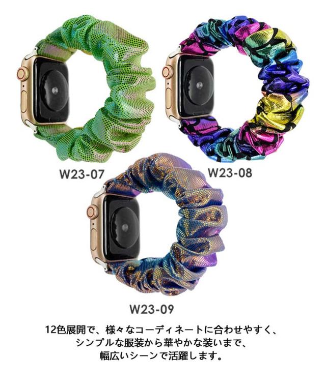 | 大人可愛いシュシュデザインのApple Watchバンド♪ 痛くない キラキラ 簡単替え おしゃれなレディースにぴったりな、Apple Watchバンドが新登場しました! シュシュ風の可愛らしいデザインが特徴です。 フリルが上品な雰囲気を醸し出し、可愛さと大人っぽさが同居したデザインとなっています。 防水加工が施されているので、日常生活やアクティブなシーンでも安心してご使用いただけます。 12色展開で、様々なコーディネートに合わせやすく、シンプルな服装から華やかな装いまで、幅広いシーンで活躍します。 バンド部分は伸縮性のあるゴム素材。締め付け感のない適度なフィット感で、寝返りをうっても外れません。寝汗をかいても蒸れにくく、朝まで眠りを邪魔しない快適な着け心地。 手首を通すだけなので着脱が簡単。カラーバリエーション豊富&ポップなデザイン、寝る時だけでなくオフィス、お出かけ、旅行などシーンを問わず使用できます。 柔らかい素材でオールシーズン使えて実用性も高いので、誕生日やクリスマス、母の日のギフトとしてもおすすめ。 <details> 1.金属製コネクター:クイック脱着可能 2.シンプルなデザイン:ヘアゴム・リストバンド 3.高品質素材:耐久性抜群・おしゃれ | |