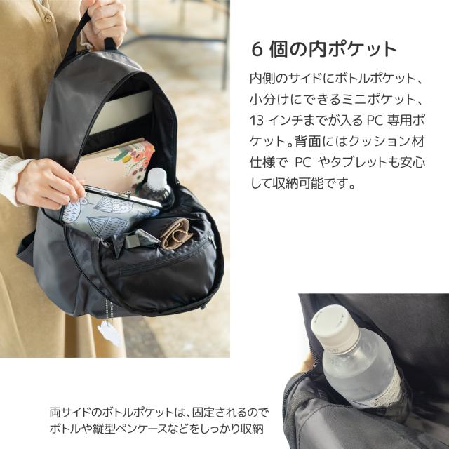 内側ポケットは全部で6個あり、内側のサイドにボトルポケット、小分けにできるミニポケット、13インチまでが入るPC専用ポケット。